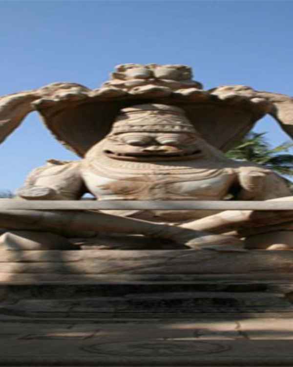 This temple features the biggest effigy in Hampi, of Narasimha sitting on SeshaNaag i.e. the seven headed snake acting as a shelter to him. The idol of Goddess Lakshmi is placed along with that of Narasimha.